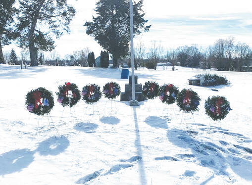 The first Wreaths Across America event was held at Decatur Cemetery on Saturday, Dec. 13 with the eight ceremonial wreaths placed near the cemetery flagpole. The ceremonial wreaths honor all those who have served, past and present, in the Army, Navy, Marine Corps, Air Force, Space Force, Coast Guard, Merchant Marine and all POW/MIAs. The cemetery is an official WAA site and next year the plan is to not only be a ceremonial site but to also offer sponsored wreaths to be placed on veteran graves.